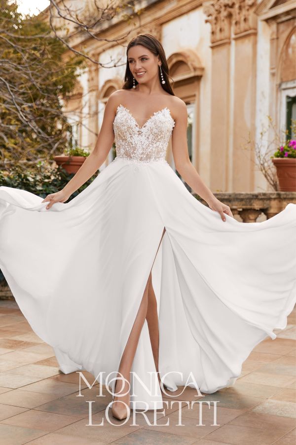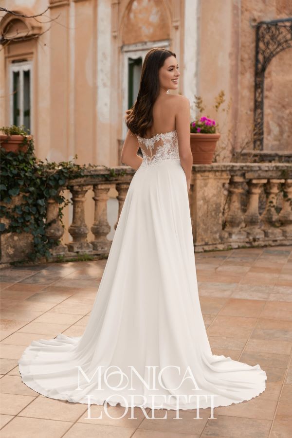 | Stil | leichte A-Linie mit fließenden Chiffonrock mit Beinschlitz, das trägerlose Oberteil hat einen tiefen Herzausschnitt und Cat Eyes, mit romantischer Spitze und Perlen verziert, die Spitze geht ganz leicht in den Rock über, der Rückenausschnitt hinten ist gerade, die Spitze im Vintage Look ist so raffiniert drapiert, dass hinten ein Herzmotiv zu sehen ist |
